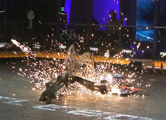 Floppy charged straight at Haymaker, which maneuvered to the side, trying to bypass Floppy's front forks. However, the impact ripped Haymaker in half, and it was counted out. Floppy won another impressive victory, dethroning the original king of flippers.
